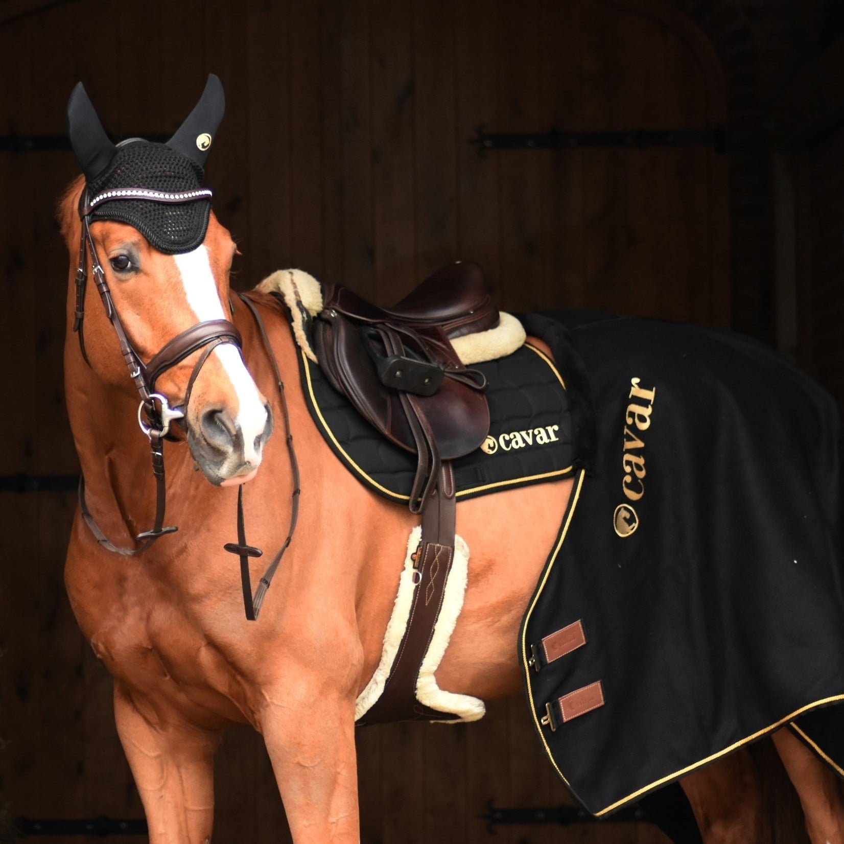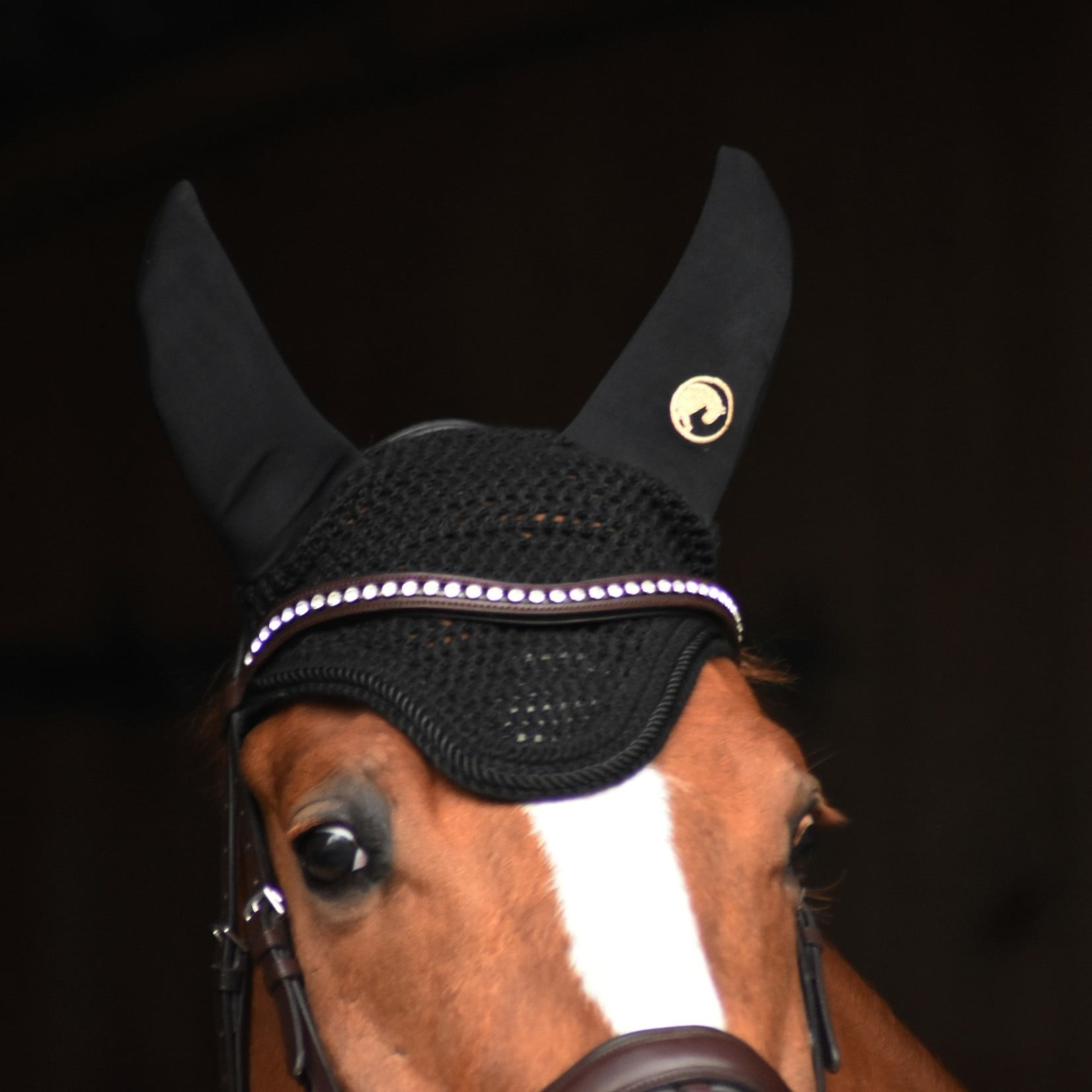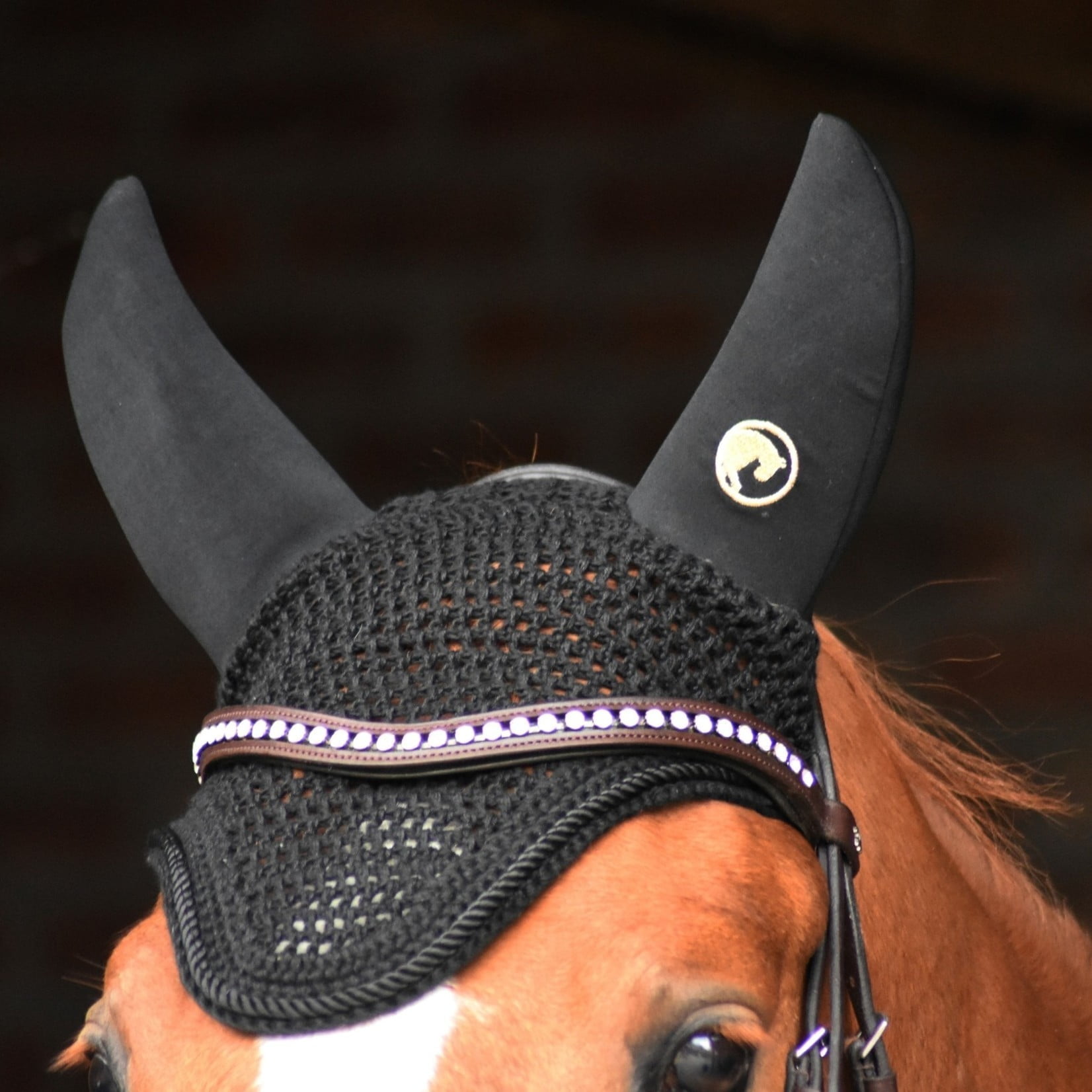 イヤーネットは全てハンドメイドです。 耳の部分は3層構造になっており、防音性に優れ、 馬の集中力を持続させることができます。