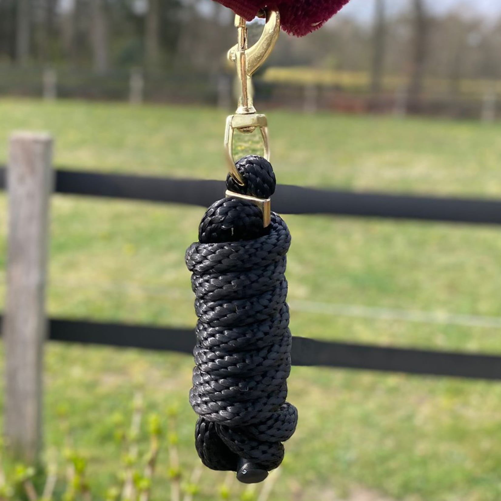 Fijn in de hand liggende halstertouwen van Cavar, stevig gevlochten en voorzien van een goudkleurige musketon sluiting. Verkrijgbaar in zwart en donkerblauw.